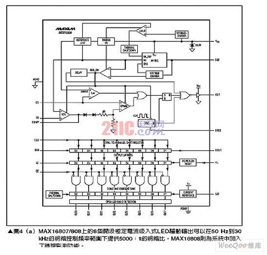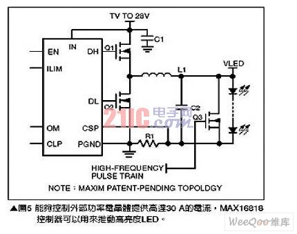 對于需要高照明功率,例如照明燈或霧燈等應用就必須使用多個高亮度LED(HighBrightLED;HBLED),但是高亮度LED卻需要超高驅動電流,要產生所需的電流會使用太多的驅動芯片,因此較簡單的解決方案是使用可以推動高電流晶體管的控制器,為高亮度LED提供高達30A的電流,這類組件的一個范例為MAX16818,請參考圖5。