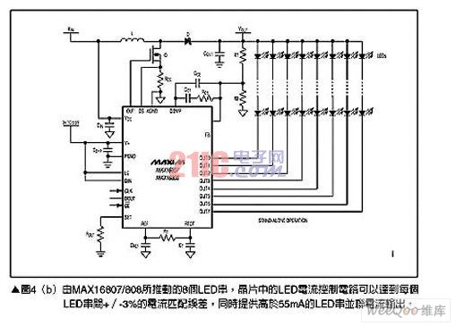 對于較小型的顯示面板,就可以使用LED矩陣來取代CCFL背光,不過使用多個LED串也會帶來相對的設計挑戰,其中最明顯的是如何能夠在整個區域提供一致的照明與色彩輸出。推動LED背光矩陣的一個方式是采用內含8個LED驅動通道,分別可以提供55mA電流輸出的MAX16807與MAX16808,請參考圖4(a),圖4(b)則顯示了采用MAX16807的典型電路如何簡化系統,只需少數幾個元件就能夠完成背光驅動子系統的設計。