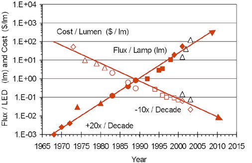 上述的講法聽來有些讓人疑惑,今日不是一直強調(diào)LED的亮度突破嗎?2003年LumiledsLighting公司RolandHaitz先生依據(jù)過去的觀察所理出的一個經(jīng)驗性技術(shù)推論定律,從1965年第一個商業(yè)化的LED開始算,在這30多年的發(fā)展中,LED約每18個月;24個月可提升一倍的亮度,而在往后的10年內(nèi),預(yù)計亮度可以再提升20倍,而成本將降至現(xiàn)有的1/10,此也是近年來開始盛行的Haitz定律,且被認為是LED界的Moore(摩爾)定律。