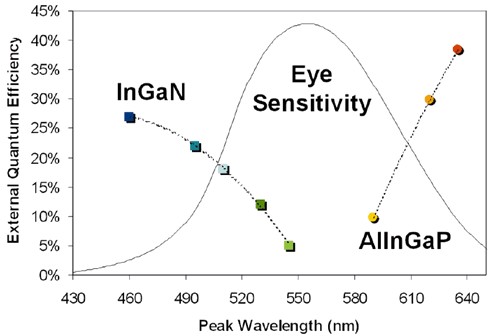 圖中為InGaN與AlInGaP兩種LED用的半導(dǎo)體材料,在各尖峰波長(光色)下的外部量子化效率圖,雖然最理想下可逼近40%,但若再將光取效率列入考慮,實際上都在15%;25%間,何況兩種材料在更高效率的部分都不在人眼感受性的范疇內(nèi),范疇之下的僅有20%。