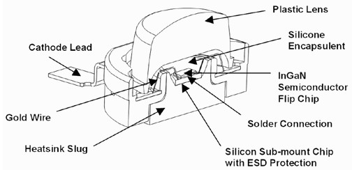 從Lumileds公司Luxeon系列LED的橫切面可以得知,硅封膠固定住LED裸晶與裸晶上的熒光質(zhì)(若有用上熒光質(zhì)的話),然后封膠之上才有透鏡,而裸晶下方用焊接(或?qū)岣啵┡c硅子鑲嵌芯片(SiliconSub-mountChip)連接,此芯片也可強化ESD靜電防護性,往下再連接散熱塊,部分LED也直接裸晶底部與散熱塊相連。