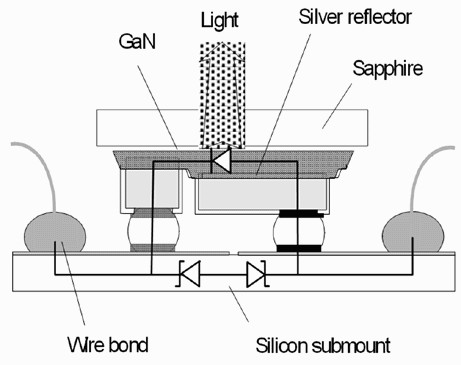 Lumileds公司Luxeon系列LED的裸晶實行覆晶鑲嵌法,因此其藍寶石基板變成在上端,同時還加入一層銀質(zhì)作為光反射層,進而增加光取出量,此外也在SiliconSubmount內(nèi)制出兩個基納二極管(ZenerDiode),使LED獲得穩(wěn)壓效果,使運作表現(xiàn)更穩(wěn)定。
