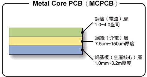 為了改善電路板層面的散熱,因此提出了所謂的金屬核心的印刷電路板(MetalCorePCB;MCPCB),即是將原有的印刷電路板附貼在另外一種熱傳導(dǎo)效果更好的金屬上(如:鋁、銅),以此來強化散熱效果,而這片金屬位在印刷電路板內(nèi),所以才稱為「MetalCore」,MCPCB的熱傳導(dǎo)效率就高于傳統(tǒng)FR4PCB,達1W/m.K∼2.2W/m.K。