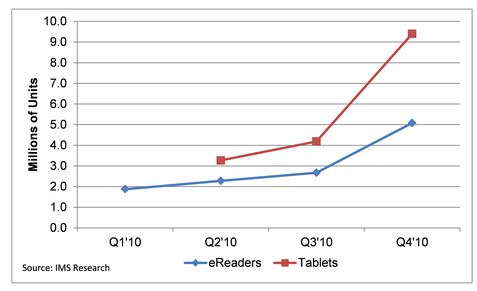 報告顯示,在2010年的假期中,平板電腦和電子書閱讀器的市場十分火爆。電子書閱讀器出貨量在2010年第四季度相比于第三季度增長了90%,而全年的增長量為116%,銷量達到了510萬臺,其中亞馬遜的Kindle和Barnes & Noble公司的NOOK成為了最大贏家。