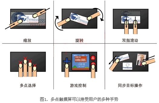用投射式觸摸屏實(shí)現(xiàn)的幾種常見的多點(diǎn)觸摸手勢(shì)包括手指的張合、縮放、雙指的滑動(dòng)和旋轉(zhuǎn)。它們可以快速方便地處理數(shù)據(jù)、內(nèi)容和用戶參數(shù)。便攜游戲和文本/電子郵件應(yīng)用也可以利用多點(diǎn)觸摸技術(shù)。在一個(gè)多指觸摸過程中,多觸點(diǎn)APA(全點(diǎn)可尋址)模式可以精確地測(cè)定每個(gè)手指所按壓的坐標(biāo)位置。