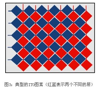 在完成了機(jī)械評(píng)估之后,必須為觸摸屏選擇一個(gè)合適的基底。圖3 顯示了投射式電容觸摸屏的一個(gè)典型ITO圖案。