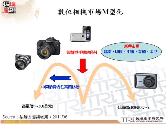 據拓墣研究所,受到消費族群往高端相機產品移動,以及新興市場所帶動的低端消費型相機銷售量,造成數碼相機市場兩端銷售狀況高起,市場呈現M型化的現象,2011下半年數碼相機的銷售量將會成長到7,900萬臺。