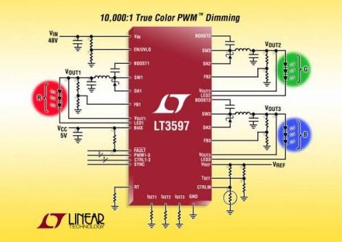 凌力爾特公司 (Linear Technology Corporation) 推出 60V、1MHz、降壓型 DC/DC 轉換器 LT3597,該器件設計成作為 3 通道、恒定電流 LED 驅動器工作。LT3597 的每個通道都含有一個吸收恒定電流的 LED 驅動器和專用的自適應輸出降壓型轉換器。這種設計為 RGB 顯示器等應用提供了最高效率,在這類應用中,每個 LED 串需要不同的輸出電壓。在 48V 輸入時,LT3597 可驅動多達 3 個 LED 串 (每串由多達 10 個 100mA 的 LED 串聯組成),提供超過 90% 的效率。LT3597 的多通道能力使其可理想地應用于大型 LED 廣告牌背光照明,也非常適用于工業、汽車和醫療顯示器。類似地,其 6V 至 60V 輸入電壓范圍使該器件也非常適合工業、汽車和醫療應用。每個 LED 串都能獨立設定,以提供高達 100mA 的 LED 電流,在 LED 串之間具有 ±2% 的電流匹配準確度。此外,每個通道可運用 True Color PWM 調光方式獨立調光,提供高達 10,000:1 的調光比。以 200kHz 至 1MHz 的可編程固定頻率工作以及電流模式架構確保在非常寬的電源和輸出電壓范圍內穩定工作,從而最大限度地減小了外部組件的尺寸。此外,開關頻率可同步至一個外部時鐘。LT3597 采用耐熱增強型 5mm x 8mm QFN 封裝,可為 LED 照明應用組成占板面積非常緊湊的解決方案。