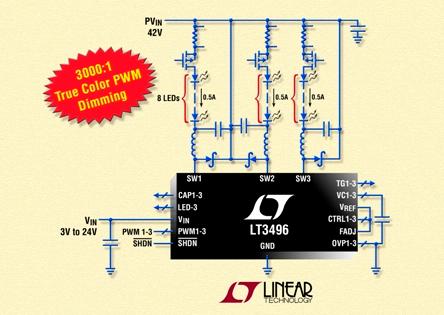 凌力爾特推出2MHz DC/DC轉換器LT3496,設計該器件以用作3通道恒定電流LED驅動器。LT3496的每個通道都可以驅動多達8個串聯的 500mA LED,因此該器件能以高達96%的效率驅動多達24個500mA LED。所有3個通道都以獨立的True Color PWMTM 信號工作,因此每個通道都能以高達3000:1的調光比獨立調光。固定頻率、電流模式架構確保在寬電源電壓和輸出電壓范圍內穩定工作。頻率調節引腳使用戶能夠在330kHz至2.1MHz范圍內對頻率編程,以優化效率,同時最大限度地減小外部組件尺寸。耐熱增強型4mm×5mm QFN 封裝允許LT3496為50W LED應用組成占板面積非常緊湊的解決方案。