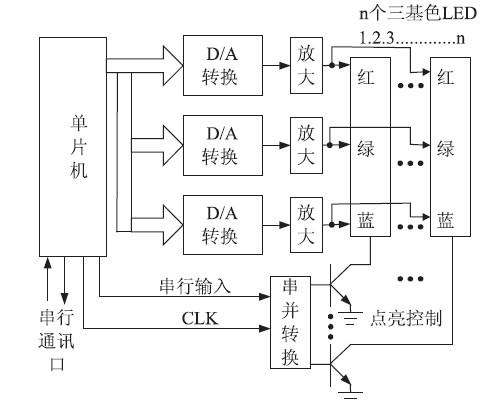 如圖2 中,87LPC762 單片機傳送數據到三路D /A 轉換器,將數字量轉換為模擬量,經功率放大電路分別控制紅、綠、藍三色LED 發光的強度,從而控制LED 發光的顏色以及亮度, 對于多個LED采用動態掃描的方式,由單片機控制兩個輸出端子以CLK 為基準輸出串行信號,經串并轉換器件控制處于開關工作的三極管分別對三基色LED 進行點亮,完成對圖形圖案的控制。最后,此系統即可完成調光所需的各項功能。串行通訊接口采用RS232標準總線與計算機連接,可將計算機中需要顯示的圖案或文字傳送到本系統并顯示出來。