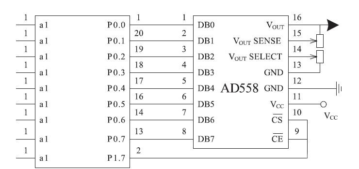 圖3 中AD558 是D /A 轉換芯片,能將數字量轉換為模擬量。單片機通過P0 口與AD558 的DB0 -DB7 連接,進行并行數據傳輸,以此控制AD558 輸出電壓的高低,輸出電壓通過功率放大控制LED 單色發光的強度。由于AD558 是8 位的D /A 轉換芯片,因此通過三路D /A 分別控制三基色時,其可將三基色中的紅、綠、藍分別分為28 = 256 份輸出,若將三基色任意組合即可最大形成2563 = 16777216 顏色和亮度的組合分辨率,通過軟件數據的設定可根據實際需要設置最大限度內任意所需要的分辨率值。