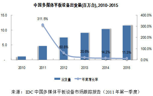 不過(guò),第二季度隨著iPad2 供貨充足以及大量其他核心廠商的新品進(jìn)入市場(chǎng),IDC預(yù)計(jì)中國(guó)多媒體平板設(shè)備市場(chǎng)仍將保持超過(guò)40%的高速增長(zhǎng)。該機(jī)構(gòu)上調(diào)2011年度中國(guó)多媒體平板設(shè)備出貨量的預(yù)期數(shù)據(jù)至468萬(wàn)臺(tái),并預(yù)計(jì)2015年出貨量達(dá)到1154萬(wàn)臺(tái)。
