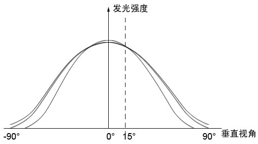 每個燈點在不同的角度觀看時亮度是不同的,且每個燈點隨著角度變化的光強分布曲線也不同。下圖為三顆LED燈點的發光強度隨垂直視角變化的示意圖線: