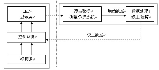 (圖一 注:圖中點劃線左側是顯示屏系統,右側是逐點校正數據采集與運算系統。)