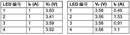 下例顯示了VF變化的影響。在實驗中,使用圖9所示兩種設置收集數據。一種設置用于4個LED,另一種設置用于并聯的4個LED。表1所示數據在25℃加電后5秒內測得,以最大限度降低LED自發熱的影響、