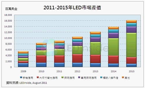 集邦科技旗下研究部門LEDinside近期發(fā)表的研究報告顯示,2011年的全球高亮度LED產(chǎn)值預(yù)估由2011年初106億美元下修至90億美元(年增率僅8%)。主要原因在于背光市場不如預(yù)期,加上LED的平均售價快速下滑導致LED產(chǎn)業(yè)供過于求。