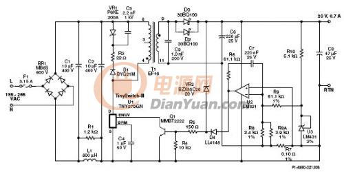 圖1所示為一個典型的20 V、14 W恒壓(CV)、恒流(CV)輸出的電源電路。LED陣列的光輸出量與所流經的電流量成正比。因此,LED驅動器應具有恒流輸出,而不是恒壓輸出。在本設計中,DC輸出未與AC輸入隔離,因而LED陣列和外殼應與用戶安全地隔離開來。