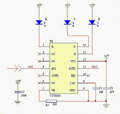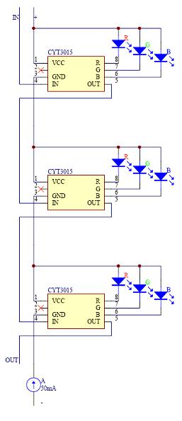 根據CYT3005單線傳輸驅動全彩LED燈設計圖,我們可以看出,單總線傳輸設計上顯得很簡單,這也是工程上最需要的傳輸方式。