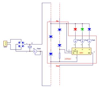 在此電路中,芯片供電利用壓差,電勢一級級的往下降,形成了梯式壓降,故而稱壓階傳輸。其實,信號傳輸也利用了壓階傳輸的方式,芯片與芯片之間的信號線串接了壓階管,這樣做的目的是經過每一級后,降低一階信號電勢,使該級芯片的信號與地之間的電勢差保持正常工作的一個差值,否則,會因為相對電勢過大而燒毀芯片。我們可以注意到這個電路只要兩條線,一條供電,一條信號傳輸,供電的線是串行的,所以總線上的電流比較小,用較細的線就行了。電路的末端,用了一個CYT1A50,它可以使整個線路恒流。另一方面,由于它的端口耐壓也比較高,可以將電路上多余的壓降壓在這顆芯片上。