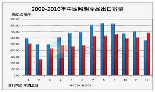 集邦科技旗下研究部門 LEDinside 研究指出,中國目前已成為照明燈具產品的制造大國,將近70%的照明產品都是由中國地區所生產,以白熾燈來說更是如此。LEDinside調查指出,2010年白熾燈、鹵鎢燈、(緊湊型熱陰極)螢光燈與其他燈具的每月平均出口數量達6.67億件,金額達11.40億美元;總計2010年出口數量達79.9億件且金額達136.77億美元,相較於2009年,數量成長24.2%,且金額成長34.7%。
