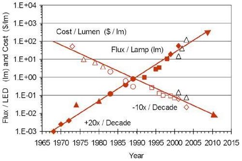 依據過去30年LED發展觀察,Lumileds Lighting公司的Roland Haitz先生于2003年歸納出LED界的Moore(摩爾)定律—Haitz定律(如圖1所示),說明LED約每18~24個月可提升一倍的亮度,以此定理推估10年內LED亮度可以再提升20倍,而成本將可降90%以達到可完全取代現有照明技術,因此LED照明于近幾年火熱的被重視與探討。