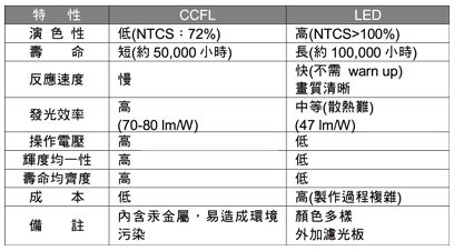 LED因耗電低、不含汞、壽命長、體積小、降低二氧化碳排放量等優勢吸引國內、外廠商極力推廣取代現有照明。 LED主要照明可分為顯示背光、車用照明、交通號志與室內室外照明,而背光模組于2009年被廣泛的應用于筆記型電腦面板上,此后亦逐漸被使用到家用電視機,其約占了50%之面板模組零組件制造成本與消耗約70%顯示器之電能,故背光照明為顯示面板最重要的關鍵。 然液晶顯示器無法自行發光,因此需要背光模組作為光線的來源,所以背光源的好壞會影響顯示的效果甚劇。 加上面板需薄型化的因素,因此多以CCFL燈管作為背光源,而LED背光源比起CCFL有演色性佳、壽命長、反應速度快等優勢(如表1)。