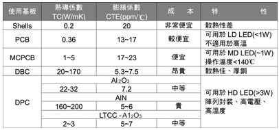 在陶瓷材料上以DPC成型之基板,具有耐高電壓、耐高溫、與LED熱膨脹系數匹配等優勢外,還可將熱阻下降到10℃/W以下,故此為現今最合適用在封裝高密度排列之HB LED散熱材料。