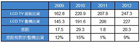 液晶電視整機出貨與面板出貨之間的差距 (單位:百萬片)
