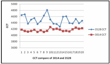 初始參數(shù)測試結(jié)果表明,在20mA電流驅(qū)動下,3014LED的光通量比3528高,且其CCT集中度比3528LED好。另3014一般在30mA電流下驅(qū)動使用,其光通量達(dá)到10~11Lm;如上節(jié)熱模擬顯示,3528LED散熱效果遠(yuǎn)不如3014LED,故其在大電流驅(qū)動下,光通量必定會嚴(yán)重受到過高熱量的影響。因此相比水平散熱LED,垂直散熱LED具有不可比擬的優(yōu)勢。
