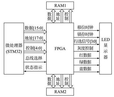 LED顯示屏是利用LED點陣模塊或像素單元組成的一種現(xiàn)代平面顯示屏幕,具有發(fā)光效率高、使用壽命長、視角范圍大、色彩豐富以及對室內(nèi)外環(huán)境適應(yīng)能力強等優(yōu)點。20世紀80年代后期,它在全世界迅速發(fā)展起來,并很快成為大屏幕平板顯示的代表性主流產(chǎn)品;近年來,隨著藍色LED產(chǎn)品價格的快速下降,全彩色LED顯示屏的價格逐步降低,市場需求急劇增長,應(yīng)用日益普遍。目前的LED顯示屏控制系統(tǒng)多采用ARM處理器來完成整個系統(tǒng)的功能,這種控制系統(tǒng)在數(shù)據(jù)處理速度上存在很大的局限,影響顯示效果的連續(xù)性。基于此,在分析了STM32微處理器總線結(jié)構(gòu)特點的基礎(chǔ)上,提出了STM32+FPGA的控制系統(tǒng)方案,該方案充分了利用STM32微處理器的靈活的儲器控制技術(shù)和可編程邏輯器件的靈活性,提高了系統(tǒng)數(shù)據(jù)處理的速度,而且簡化了電路結(jié)構(gòu),方便調(diào)試。