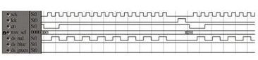 掃描驅(qū)動輸出信號的仿真波形如圖5所示,其中en是灰度控制信號,用來控制顯示時間,產(chǎn)生灰度效果;row_sel是行選信號,顯示時用于確定點亮哪一行;sck是移位時鐘,lck是鎖存時鐘,ds_red、ds_blue、ds_green是上屏紅、藍、綠數(shù)據(jù)的輸入端。仿真時紅、藍、綠顯示數(shù)據(jù)分別設(shè)定為01交錯、全1、全0。可以看到,在移位時鐘的作用下數(shù)據(jù)移位正確,移位完成后,lck變?yōu)楦唠娖剑瑢?shù)據(jù)鎖存輸出到LED屏上顯示。