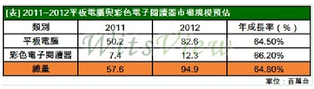 整體而言, WitsView 認(rèn)為 2012年平板電腦的發(fā)展基調(diào)將偏向樂觀,預(yù)估平板電腦本身的需求達(dá)8,260萬臺(tái),彩色電子閱讀器方面則為1,230萬臺(tái),兩者合計(jì)的市場規(guī)模將從今年的5,760萬臺(tái)攀升至9,490萬臺(tái),年成長率高達(dá)65%。