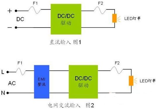 面對LED照明的眾多應用領域,由于市場并沒有形成統一的規范,存在多種多樣的驅動解決方案,但是萬變不離其中,從過流保護的角度來看大體上根據燈體的輸入電流來可以分為:直流輸入和電網交流輸入兩種最基本的類型,兩種類型的主要區別在于驅動電源是否有交流轉直流的模塊。當然市場上也有很多電阻、阻容降壓等低成本解決方案,沒有EMI整流和恒流驅動的模塊,但是由于初級端保險絲的選用要求與圖2是一致,在此歸入第二種類型。