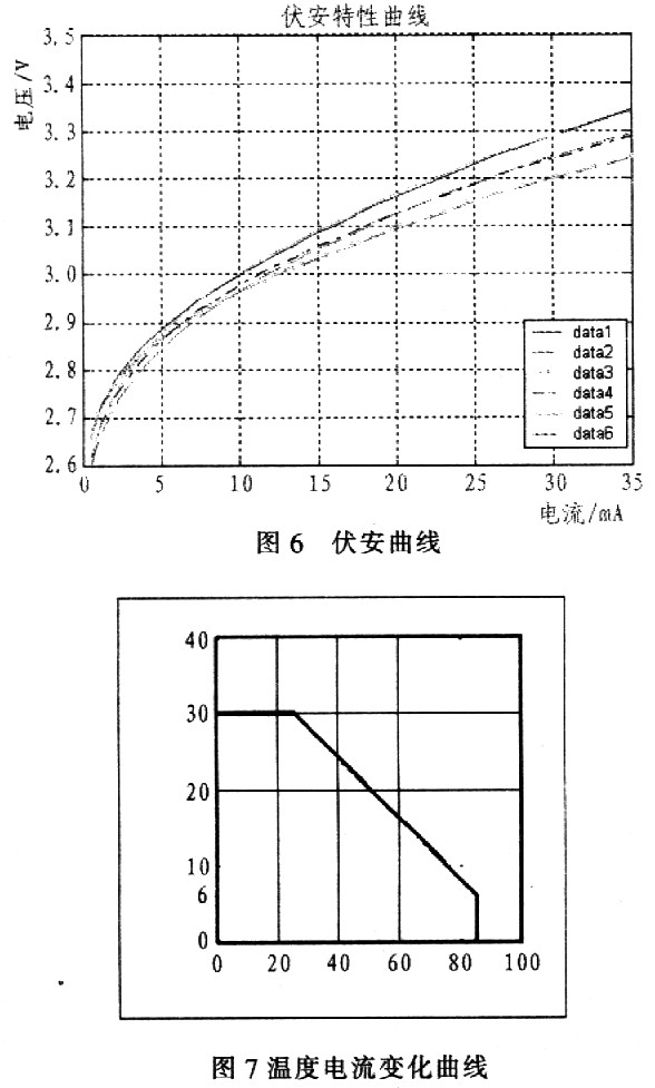 圖6和圖7分別為LED的伏安曲線和溫度電流曲線。由LED發光原理可以知道,白光LED的亮度變化主要是由其通電電流決定的。