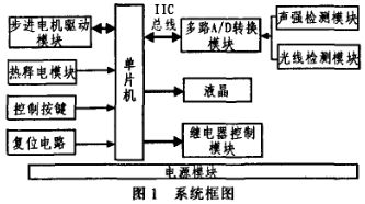 本系統主要以單片機總控制為核心,由微弱聲音放大檢測、可見光檢測、步進電機旋轉熱釋電紅外傳感器、A/D轉換、液晶顯示等模塊以及控制電路組成。系統框圖如圖1所示。