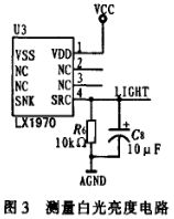 可見光檢測模塊采用LX1970作為核心芯片。LX1970是美國微型半導體(Microsemi)公司推出的一種能實現人眼仿真的集成化可見光亮度傳感器。該模塊采用測量白光亮度電路(如圖3)。利用src端輸出光-流轉換的結果,然后實現流壓轉換。該芯片性能穩定,靈敏度極高。