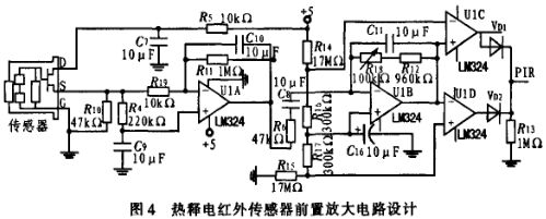 熱釋電紅外傳感器能以非接觸形式檢測出人體輻射的紅外線,并將其轉變為電壓信號。本設計所采用的是PIR熱釋電傳感器,安裝有菲涅爾透鏡,感應距離7 m,感應角度110°。具有全自動感應、光敏控制、兩種觸發方式(不可重復觸發方式,可重復觸發方式)、靈敏度高、微功耗等特點。當人進入其感應范圍,則輸出高電平,人離開感應范圍,則自動延時關閉高電平,輸出低電平。但是該熱釋電紅外傳感器只能檢測到動態,所以對于長時間處于相對靜態的存在無法檢測的缺陷。熱釋電紅外傳感器前置放大電路如圖4所示。
