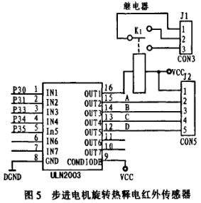 為此,采用了步進電機模塊。設計中,將熱釋電紅外和步進電機固定一起。單片機P1.0~P1.3口分別經過74LS14雙上升沿D觸發器電平轉換后,通過芯片ULN2003驅動步進電機旋轉(電路設計如圖5),從而可以旋轉熱釋電紅外傳感器,檢測到靜態。