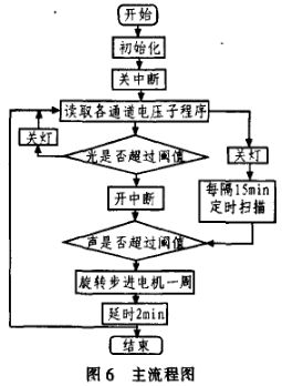 本系統以單片機AT89S52為核心,采用光照檢測、聲控以及步進電機旋轉熱釋電紅外等傳感器進行環境探測。系統首先啟動可見光模塊,通過光一流一壓轉換后,經過A/D轉化為數字量并通過液晶顯示。若是電壓較小,說明了亮度不夠,則繼續檢測聲音。若是聲音較大,則在短時間內調用步進電機模塊,檢測是否有人;否則,每隔15 min定時檢測。因為在實際過程中,設置聲光的閾值都缺乏直觀性,所以使用液晶電壓顯示進行判斷。光、聲的閾值可以根據不同地方的實際情況通過軟件進行調整。