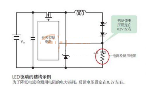 通常,開關穩壓器IC設定的反饋電壓約為1.2V。但對于LED驅動IC,1.2V過大。因為把輸出電流轉換成電壓的數百mΩ 的電阻(電流檢測用電阻)需要與LED串聯。對于照明器具等使用的高亮度LED,流經的是1.5A和2A等大電流。如果500mΩ的電流檢測用電阻中通過1.5A的電流,僅此一項就會產生0.75W的電力損耗。因此,LED驅動IC把反饋電壓設定在了非常低的0.2V左右。這樣一來,不僅可以使用較小的電流檢測用電阻,而且在大電流通過時,也可以把電力損耗控制在較低的水平。