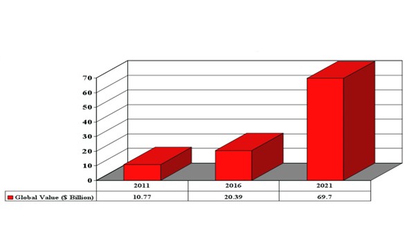 報告預(yù)測,到2021年,高亮度LED的全球消費量有望達(dá)到697億美元。這個數(shù)據(jù)是指一個特定的日歷年度的消費量,而不是累積數(shù)據(jù)。