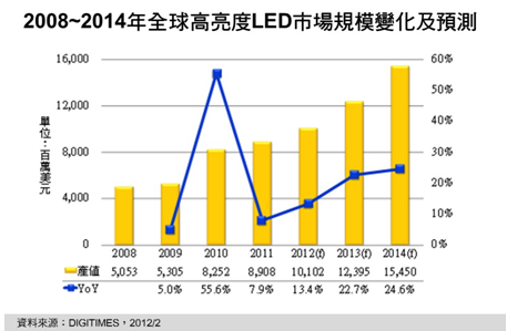 • 2012年全球高亮度LED產值年成長率將為13.4%