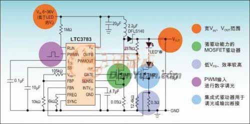 圖:基于LTC3783的大功率PWM LED驅(qū)動(dòng)電路