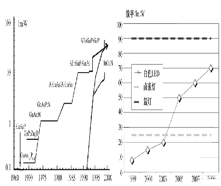 圖2 LED 發光效率發展趨勢( 左) 及與傳統光源效率比較( 右)