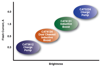 LED越來越多地應用于拍照手機、智能手機和氙氣燈泡替代,且光輸出能力不斷提供,從而滿足更高的性能需求。安森美半導體的CAT3612、CAT4131、CAT4134和CAT3224都是這類驅動方案。這些器件分別采用電荷泵、電感升壓拓撲結構,可以提供不同的閃光電流和亮度。