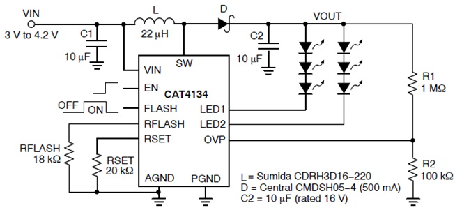 以CAT4134為例,這是一款大功率電感升壓型雙通道驅動轉換器,提供2路匹配的LED電流。輸出電流級別通過2個電阻之一RSET或RFLASH來控制。當FLASH輸入引腳為低(電影模式),電阻RFLASH設置LED電流。每個通道驅動2或3個白色串聯LED,并提供1個可調節電流以控制其亮度。支持輸入電壓低至3V,使得器件適合于鋰離子電池的應用。