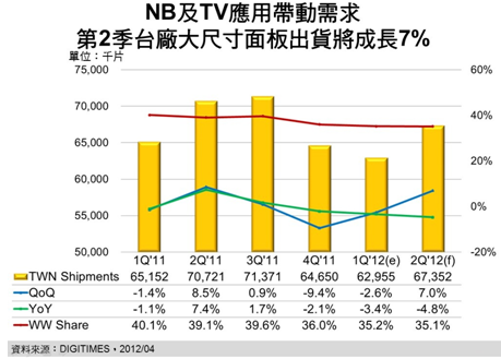 2012年第2季臺廠大尺寸(9寸以上)TFT LCD面板總出貨量將為6,735.2萬片,較前一季增加7%,但較2011年同期則減少4.8%,DIGITIMES Research資深分析師兼副主任黃銘章分析,主要原因?yàn)椴示Ъ叭A映相繼地淡出大尺寸面板市場,2011年華映的各類NB面板出貨達(dá)到664萬片,但2012年將降至不足100萬片。因此,預(yù)期臺廠佔(zhàn)全球出貨量比重在第2季仍將微幅下跌0.1個百分點(diǎn)至35.1%。