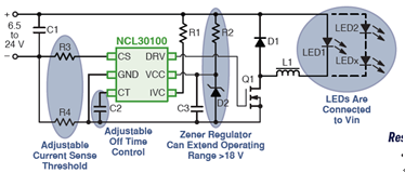 該驅動器控制器開關頻率高達700kHz,不需要輸出電容,Vcc工作范圍從6.35至18 V,可驅動一個或多個大功率LED,主要用在MR16 LED照明、環境燈照明、太陽能LED、交通照明、室外照明和LED光條等應用。采用NCL30100的PCB非常小巧,可以裝入MR16燈的燈座內。NCL30160的遲滯控制特性可在負載瞬期間提供快速的響應,無需小型信號控制環路補償元件。保護特性包括可利用電阻設定LED電流、LED短路保護、欠壓鎖定及熱關閉。