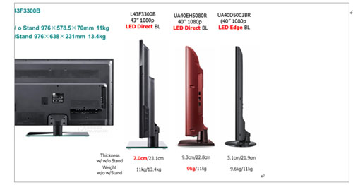 事實上,BMS模式對于品牌廠商而言并非完全出于成本考慮,而更側(cè)重于產(chǎn)品的差異化,以及品牌廠商將對渠道和消費者的理解體現(xiàn)在具體產(chǎn)品上,這對于提升品牌廠商終端產(chǎn)品競爭力而言至關(guān)重要。因此,我們可以發(fā)現(xiàn),從2010年起,幾乎所有一線品牌廠商新增的系統(tǒng)組裝產(chǎn)品均為BMS模式。以下為TCL在BMS模式下生產(chǎn)的直下式的LED電視在基本外觀尺寸上與Samsung最新推出的直下式產(chǎn)品對比。從相關(guān)的指標來看,中國本土品牌在BMS一體化制造的能力已經(jīng)取得了非常大的進步,甚至領(lǐng)先一步。