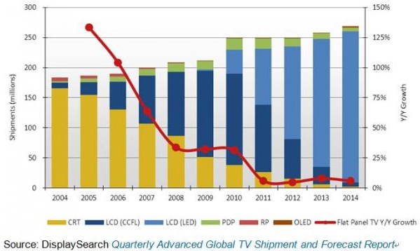 根據(jù)NPD DisplaySearch季度全球電視出貨和預(yù)測報(bào)告Quarterly Advanced Global TV Shipment and Forecast Report指出,全球電視出貨量連續(xù)兩年持平,2012年出口到西歐、日本等發(fā)達(dá)市場的電視總量預(yù)計(jì)將較去年下降11%,由此抵消了新興市場8%的年成長。盡管如此,隨著CRT和等離子電視逐步淡出市場,液晶電視將持續(xù)獲得更大市場份額。